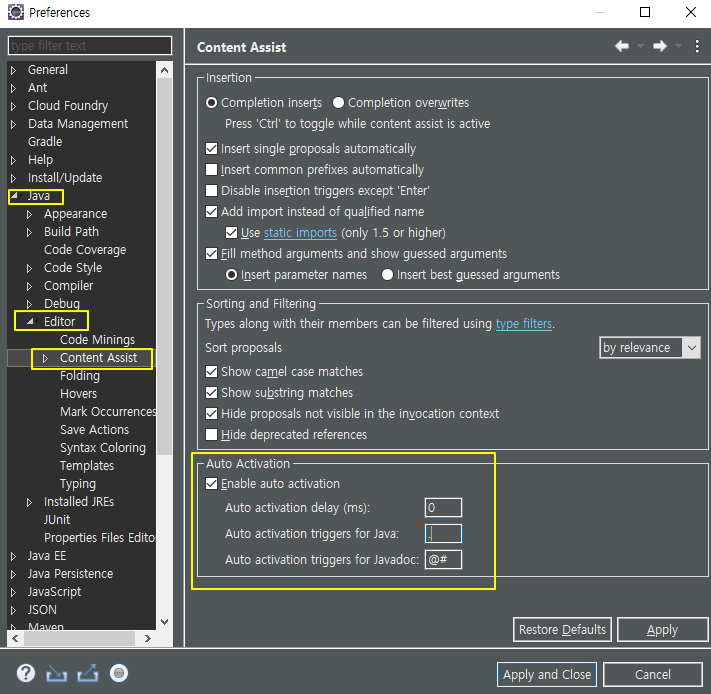 (위 과정으로 들어가는게 귀찮다면, type filter text 검색란에 content assist를 바로 검색하자)