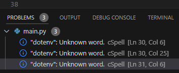 글자에 밑줄이 그어져 있거나 PROBLEMS 탭에 관련 내용이 보임