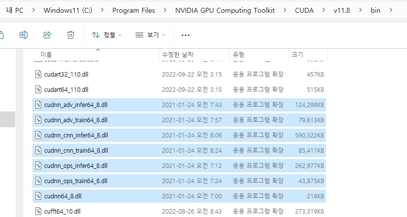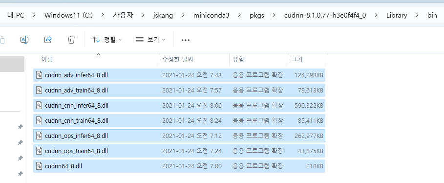 C:\Users\jskang\miniconda3\pkgs\cudnn-8.1.0.77-h3e0f4f4_0\Library\bin 에 있는 모든 dll을 복사후 CUDA 설치 폴더에 넣어줌 C:\Program Files\NVIDIA GPU Computing Toolkit\CUDA\v11.8\bin\