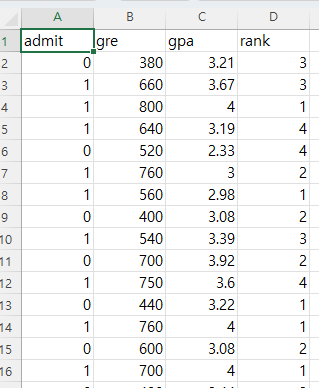 y데이터 = data['admit'].values #리스트로 담아줌 [0 1 1 1 0 1 1 ...]
