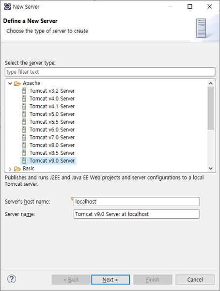 Apache -> Tomcat v9.0 Server 선택후 Next