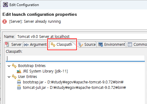 상단 탭 메뉴들 중에 Classpath 라고 있는데 이 곳을 확인해서 bootstrap.jar의 경로가 올바른지 두개를 참조하고 있는지 등을 확인한다.(한개만 있어야 됨)