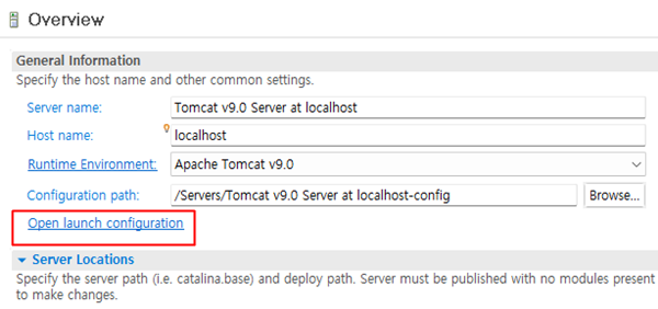 이클립스 -> Servers 탭 -> 서버를 더블클릭 -> Overview 창 -> General Information -> Open launch configuration