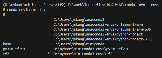 (D:\myhome\miniconda3-envs\tf2) E:\work\Tensorflow_딥러닝AI>conda info --envs