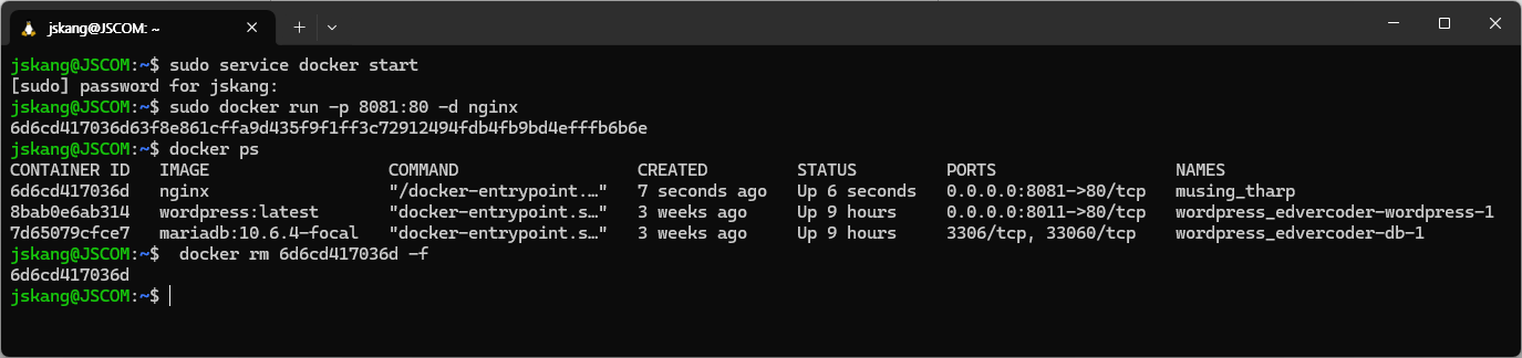 docker rm 컨테이너ID -f #컨테이너 강제 중지후