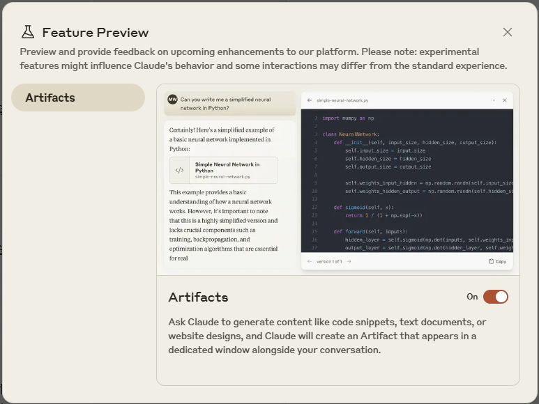 Claude AI에서 코드 작성시 코드를 그냥 보는것뿐만 아니라 미리 실행해 볼수 있는 기능이Artifacts 입니다.