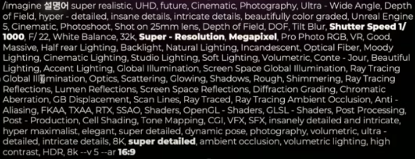 /imagine 설명어 super realistic, UHD, future, Cinematic, Photography, Ultra-Wide Angle, Depth of Field, hyper-detailed, insane details, intricate details, beautifully color graded, Unreal Engine 5, Cinematic, Photoshoot, Shot on 25mm lens, Depth of Field, DOF, Tilt Blur, Shutter Speed 1/ 1000, F/22, White Balance, 32k, Super-Resolution, Megapixel, Pro Photo RGB, VR, Good, Massive, Half rear Lighting, Backlight, Natural Lighting, Incandescent, Optical Fiber, Moody Lighting, Cinematic Lighting, Studio Lighting, Soft Lighting, Volumetric, Conte - Jour, Beautiful Lighting, Accent Lighting, Global Illumination, Screen Space Global Illumination, Ray Tracing Global Imination, Optics, Scattering, Glowing, Shadows, Rough, Shimmering, Ray Tracing Reflections, Lumen Reflections, Screen Space Reflections, Diffraction Grading, Chromatic Aberration, GB Displacement, Scan Lines, Ray Traced, Ray Tracing Ambient Occlusion, Anti- Aliasing, FKAA, TXAA, RTX, SSAO, Shaders, OpenGL - Shaders, GLSL - Shaders, Post Processing, Post-Production, Cell Shading, Tone Mapping, CGI, VFX, SFX, insanely detailed and intricate, hyper maximalist, elegant, super detailed, dynamic pose, photography, volumetric, ultra- detailed, intricate details, 8K, super detailed, ambient occlusion, volumetric lighting, high contrast, HDR, 8k --v 5 --ar 16:9