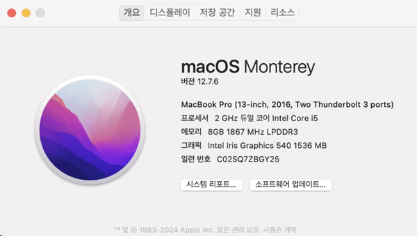 내 맥북의 OS12 버전인데 더이상 업데이트가 안된다. 2016년 맥북프로인데 더이상 업데이트는 안된다고 한다. -.-;;;; 기기도 비싸면서. 얼마 안됐는데... 10년밖에 안됐는데 업데이트를... 기록 차원에서 이글을 작성함.